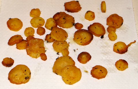 You can remove even more of the fat using kitchen paper. Season with salt and freshly ground white pepper. (Seasoning at the end gives better texture, as my experiment with potatoes showed.) I served the roasted parsnips with the venison stew that I will post tomorrow.
