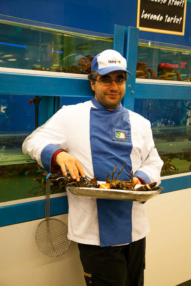 I took Conor and the wife shopping for live lobsters (as well as for sightseeing at the nearby Zaansche Schans — windmills, wooden shoes, cheese, and a very flat and green Dutch landscape). The salesperson was a good sport and posed for Conor’s camera, stroking one of the lobsters. When buying live lobsters, always make sure that they are struggling when taken out of the tank. If not, make sure to ask for another one!