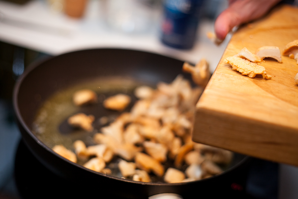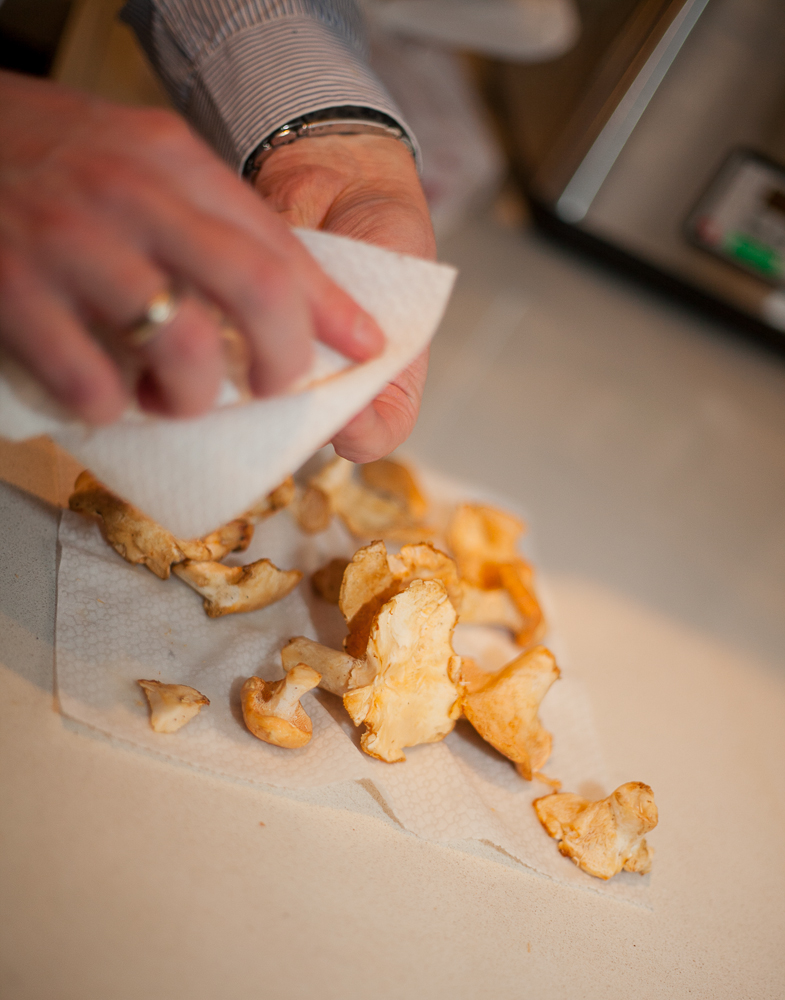 Meanwhile, wash the mushrooms and dry them carefully with paper towels. (Unlike what you hear often it is okay to wash mushrooms. Just don’t use more water than necessary — I wouldn’t submerge them.)