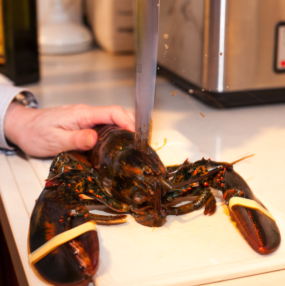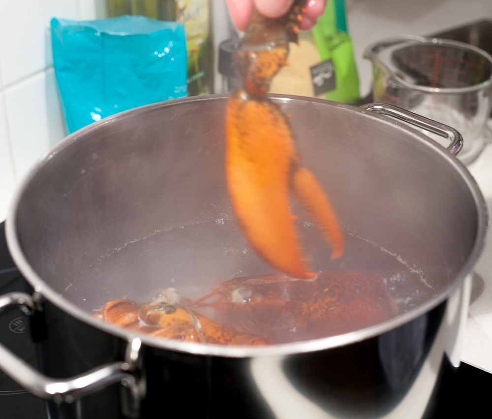 Although it is not as nice for us humans to perform this act, it is apparently nicer for the lobster to plunge a knife through its brain to kill it instantly before submerging it in boiling water.