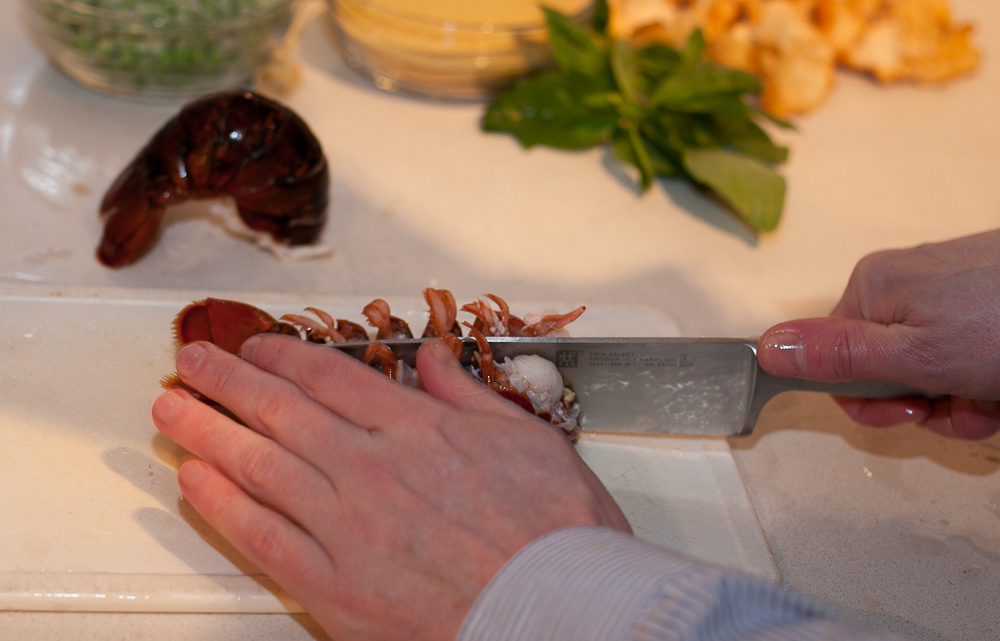 With a chef’s knife cut the tails in half lengthwise. This makes it easy to remove the meat, and the tail will be used for two servings anyway.