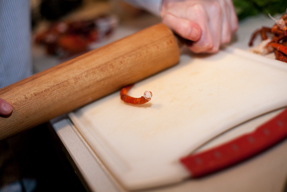 Make sure that the end of the leg is open, otherwise the meat can’t come out. Throw the shells of the legs back into the pot.