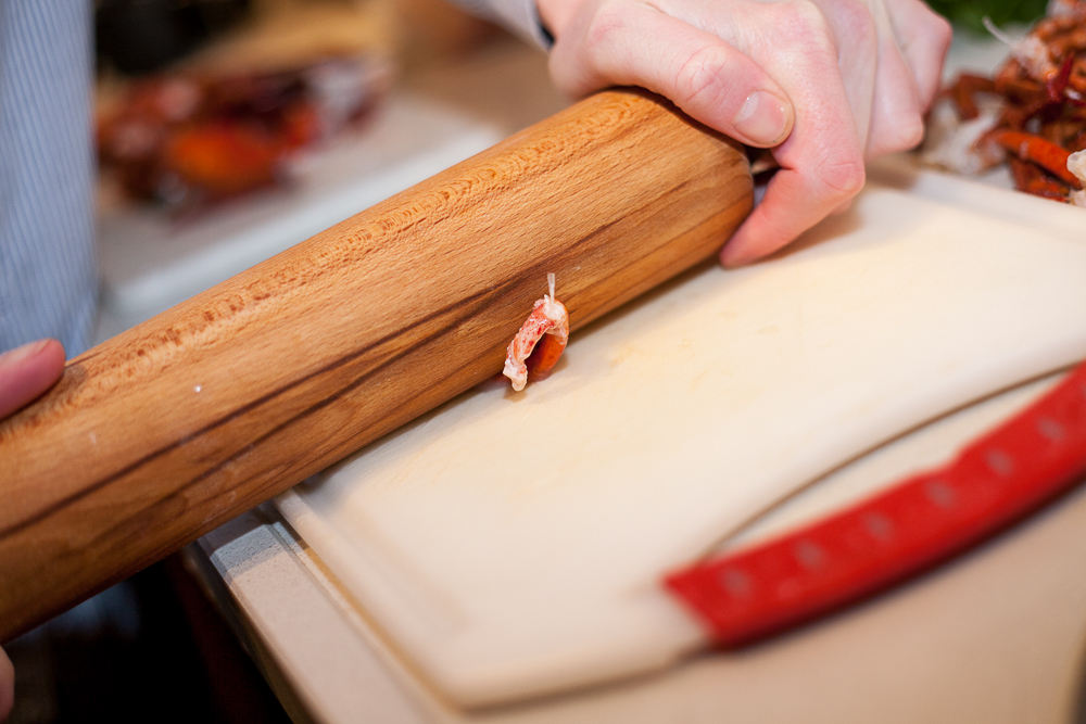 Take the meat out of the tails. It will be still raw at this point, but it should be easy to take it out with your fingers or a spoon. Throw the shells back into the pot with the heads.