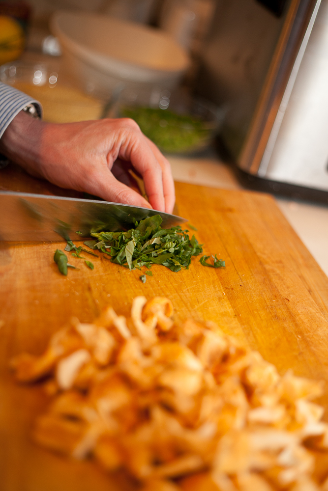 Cut enough basil leaves with a sharp knife to obtain about two tablespoons of basil strips. Try to bruise the leaves as little as possible. Basil is not chopped because then it would release its wonderful aroma prematurely.