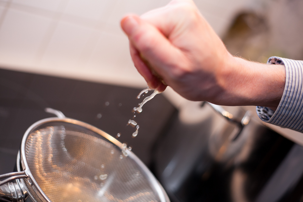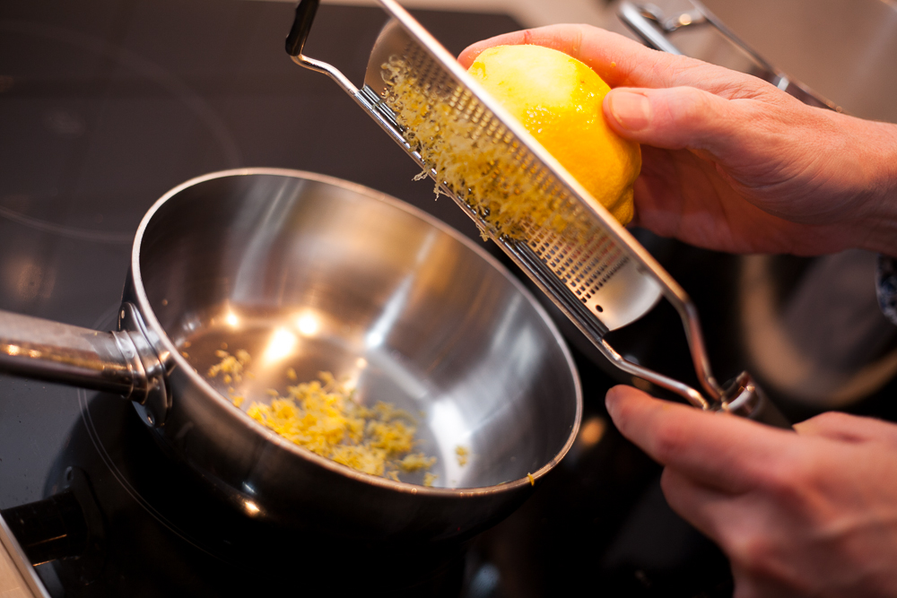 Juice the lemon into the same saucepan. It is a good idea to use a sieve, so you won’t have to fish out the pits.