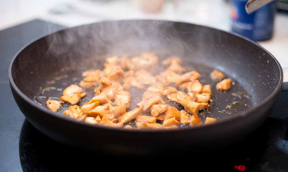 With the live lobsters we had meat from the claws and legs as well, which meant one lobster was enough for two. The trumpet mushrooms that Richard used didn’t look at all like the trumpet mushrooms we have around here (trumpet of the dead, black chanterelles) so we decided to go for pied de mouton (literally sheep’s feet in French, hedgehog mushrooms) because the sweet flavor would go nicely with the lobster. Richard uses “rich coconut milk” in his recipe, which is the part of the milk at the top of the can of coconut milk. I used “santen” instead, which is creamed coconut and means you won’t have a leftover can of skim coconut milk.