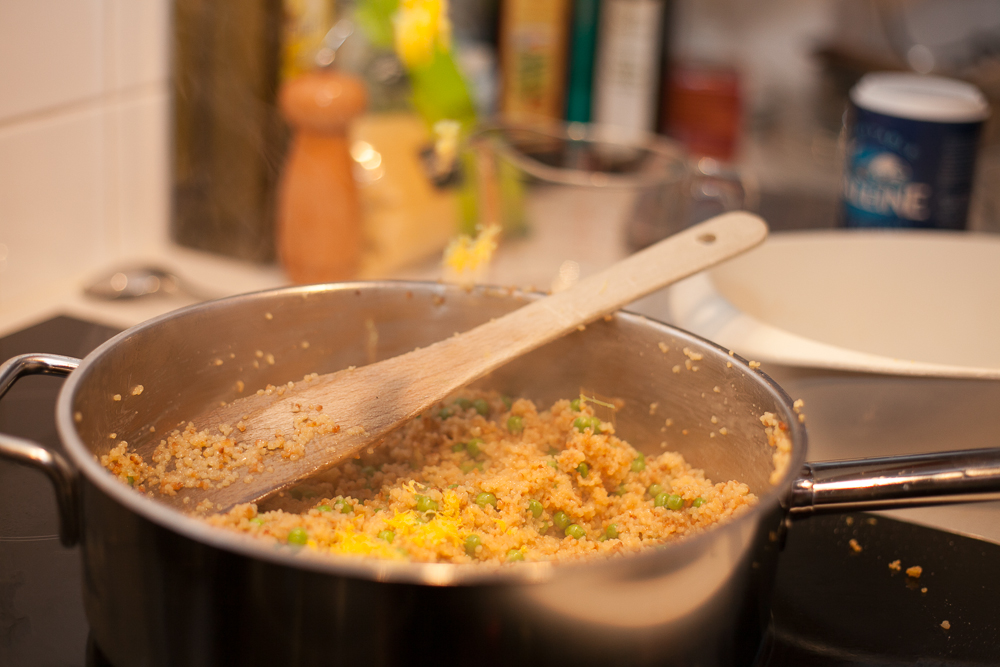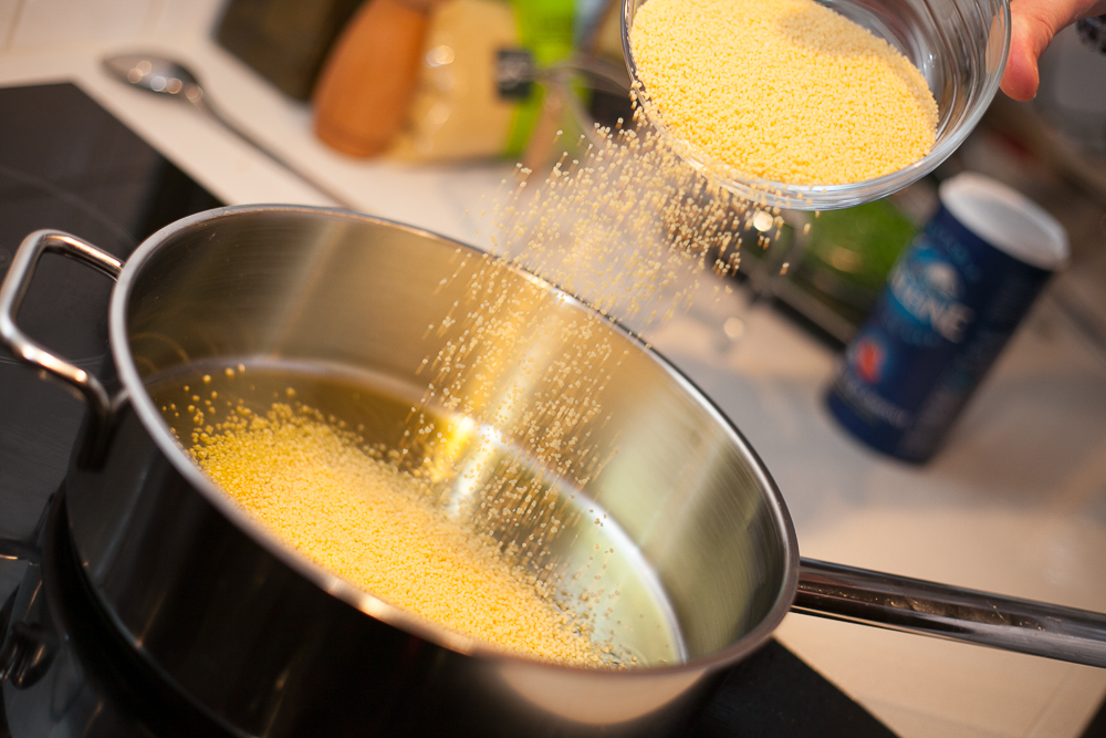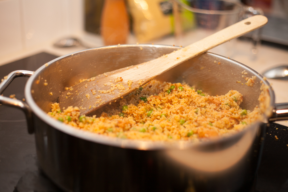 Heat olive oil in a frying pan and add the couscous. Toast for about 5 minutes, stirring, until the couscous is golden.