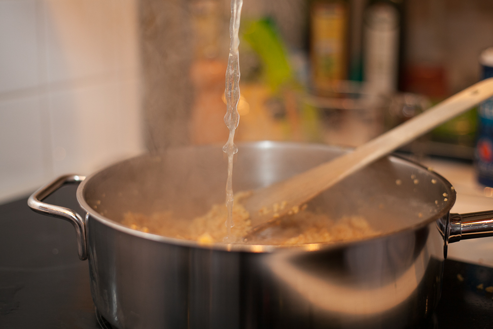 Add some lobster stock to the couscous and stir. Keep adding lobster stock and stirring until the couscous is cooked, about 10 minutes.
