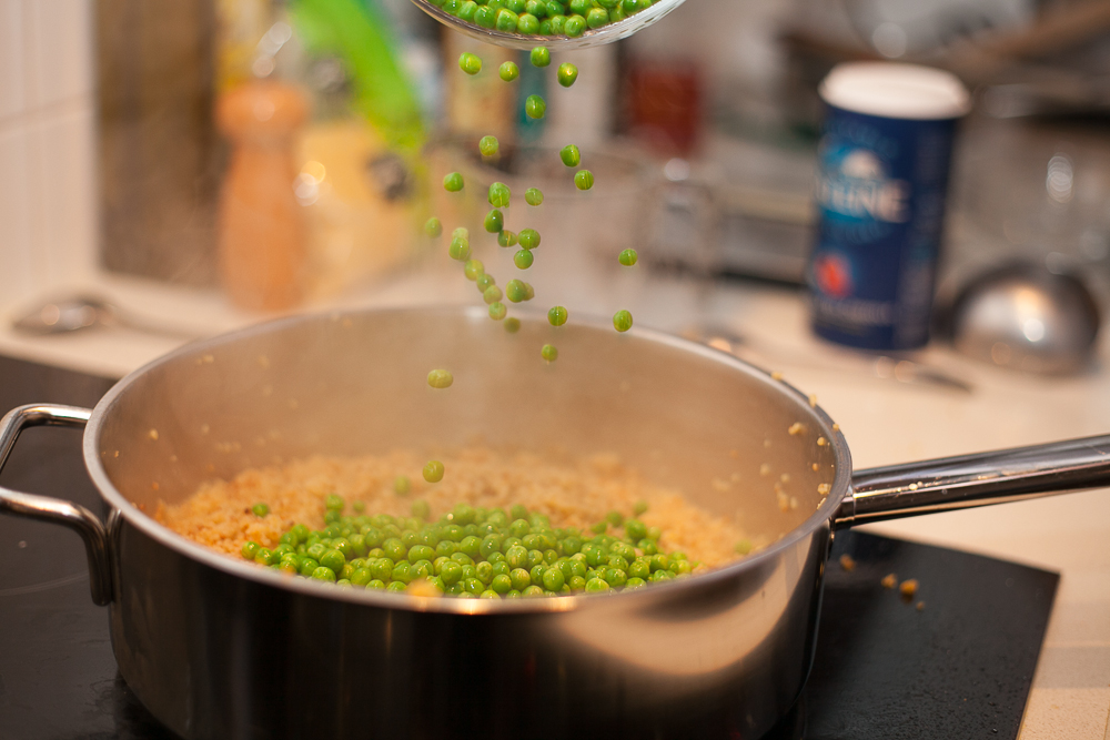 Add the peas as well. (Depending on the type of frozen peas you use, you may have to cook them first. Check the package for instructions.)