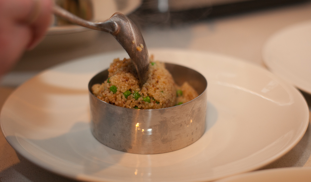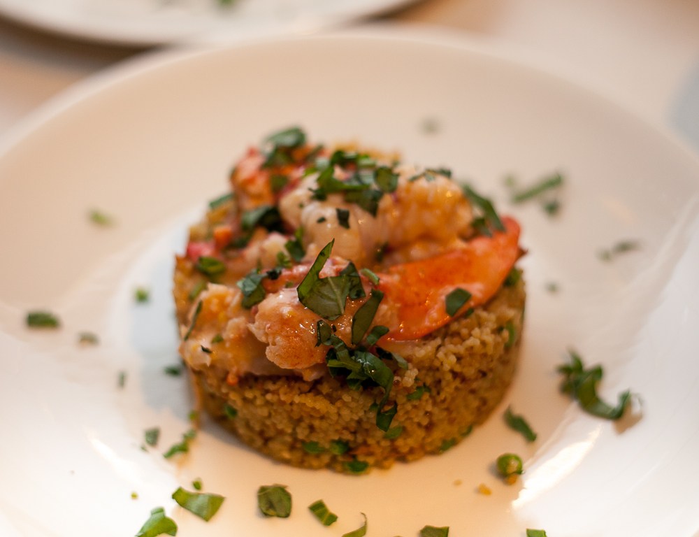 When the lobster has finished cooking sous-vide, arrange the couscous on warm plates using a ring mold.