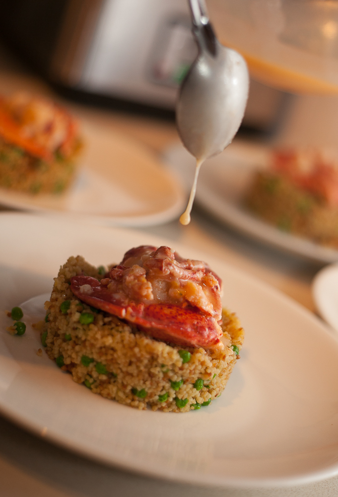 Take the lobster out of the water bath. Pour the beurre monté into a warm bowl (so it won’t cool off too much). Arrange the lobster meat on top of the couscous.