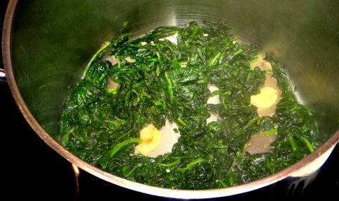 Melt 2 Tbsp butter in a large pot or casserole (big enough to hold all of the uncooked spinach) and add the garlic halves. Sauté until the garlic is golden, but make sure not to burn the butter.