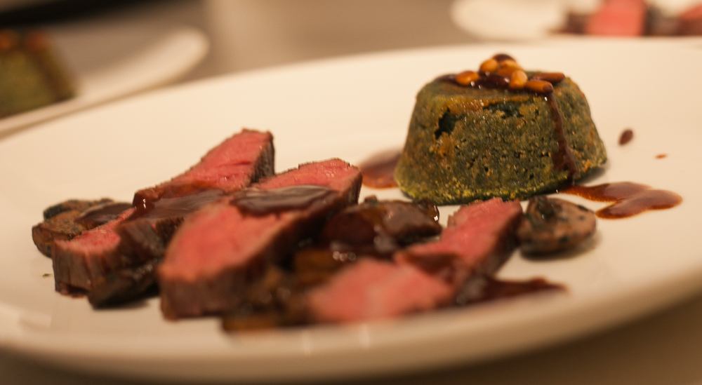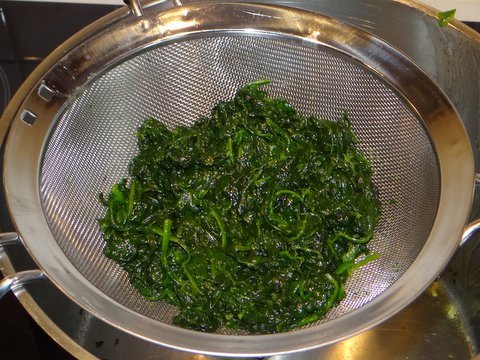 It was easy to decide upon a secondo (main course) for the welcome dinner for Conor. Since I knew he’d like to try sous-vide and he likes beef, I decided on Wagyu Flank Steak, cooked 48 hours at 55C/131F, seared in clarified butter and served with a red wine and beef stock reduction and sautéed mushrooms. But what about a side? I had picked out a great 1997 Barolo Brunate from Enzo Boglietti, and thought that something with spinach from the region of the wine (i.e. Piemonte) would be appropriate. (Spinach does not only taste well with beef, a scientific study has shown that green vegetables with a lot of chlorofyl like spinach can neutralise the increased risk of colon cancer that is associated with the consumption of red meat without green vegetables.)
