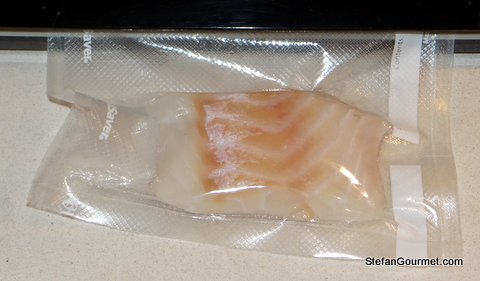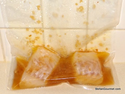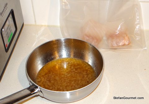 Add the sauce to the fish in the pouch. Seal it with as little air as possible by submerging it into the water bath and sealing it when the whole bag has been submerged. Cook 30-60 minutes at 41C/106F. (This is one of the nice things about sous-vide cooking: the fish will be fine anywhere between 30 and 60 minutes.)