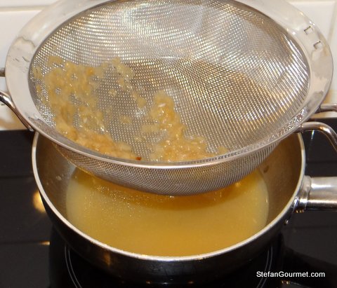 Take the fish out of the pouch (gently as it flakes easily) and allow to cool slightly. Sieve the sauce into a saucepan.