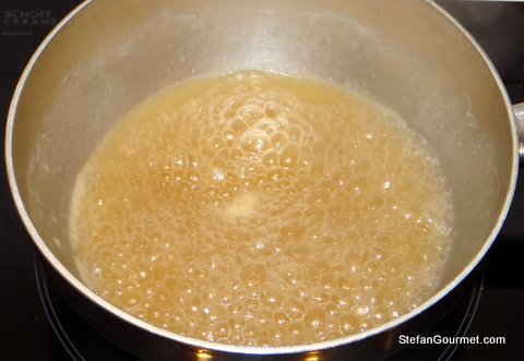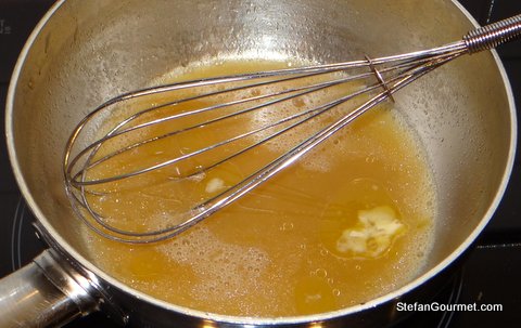 Take off the heat and mount the sauce with butter by whisking small flakes of cold butter into the hot sauce. The sauce should become thicker and shiny.
