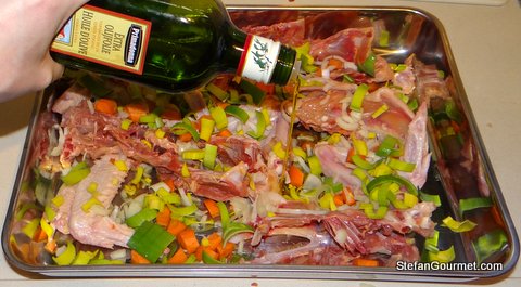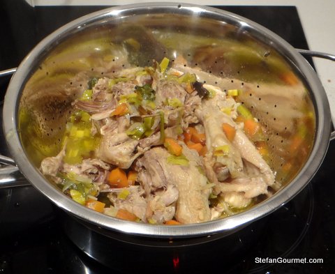 Good quality chicken is often sold as whole chickens. I take off the legs and breast, and use the rest to make stock. When making stock from bones, chefs differentiate between ‘white’ stock and ‘brown’ stock. The difference is that white stock is made from raw or blanched bones, whereas for brown stock the bones are roasted first. Brown stock has a more rich, fuller flavor than white stock. For the best Coq au Vin sauce, it is best to use a brown stock. Since I posted about Coq au Vin the other day, I thought I’d share a recipe for brown chicken stock with you. Please note that I did not include salt in the recipe because it is never a good idea to add salt to stock before you know what you are going to do with it. You may have to simmer the stock down to make a sauce, and then it may end up too salty.