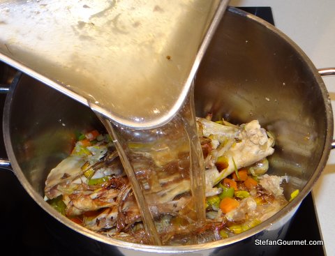 Add the water from the oven dish to the stock pot. Add more water until you have added about 1 liter (1 quart). Add a bit more if needed to cover the bones and vegetables.