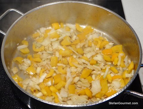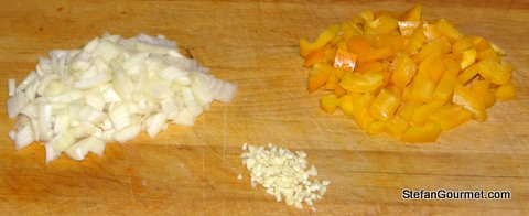 Chop the onion, mince the garlic, clean the bell pepper and cut it into 1 cm (1/2″) pieces.