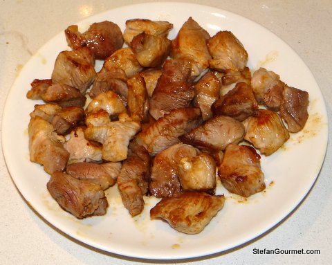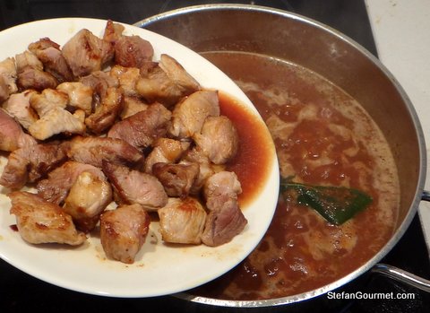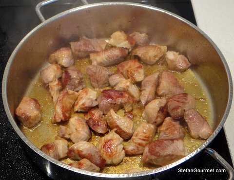 Cut the pork into cubes (skip this if using ribs) and pat dry with paper towels. Heat the oil in a frying pan or casserole and add the pork.