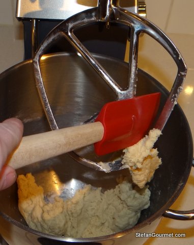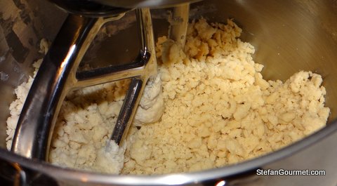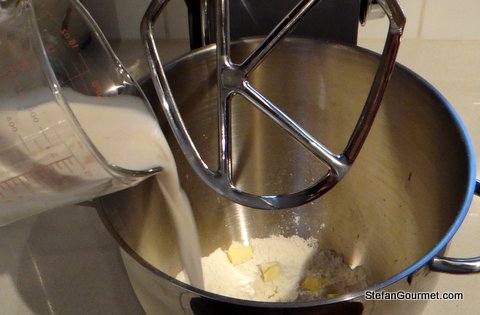Combine the flour, butter, sugar and salt in the bowl of a stand mixer fitted with the paddle attachment. Add the milk and yeast mixture.