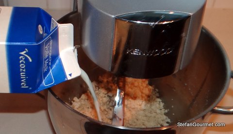 While the machine is running, add just a bit more milk until the dough comes together. This is probably not more than a single tablespoon of milk.