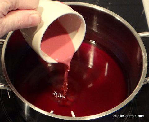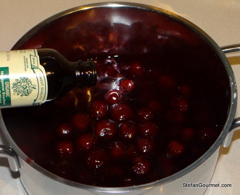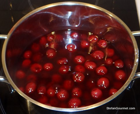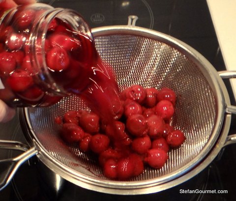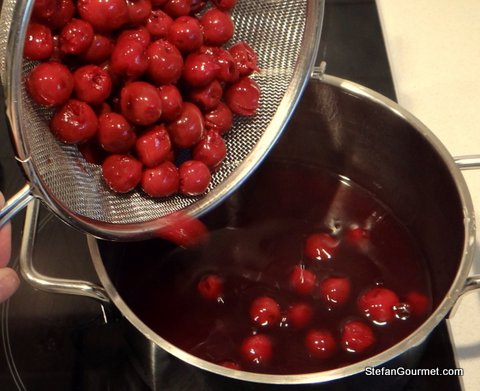 Meanwhile, drain the cherries and catch the syrup in a saucepan.