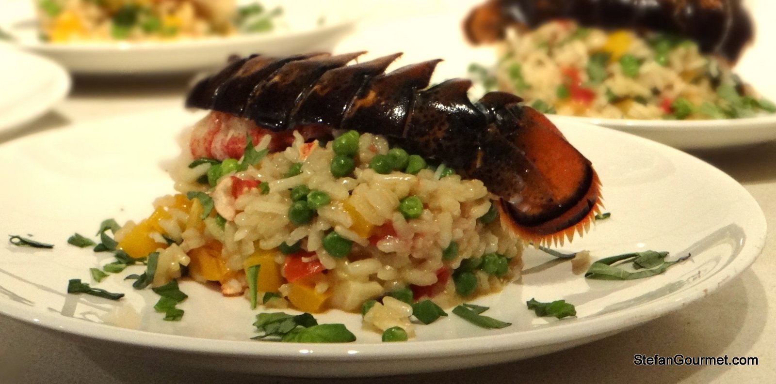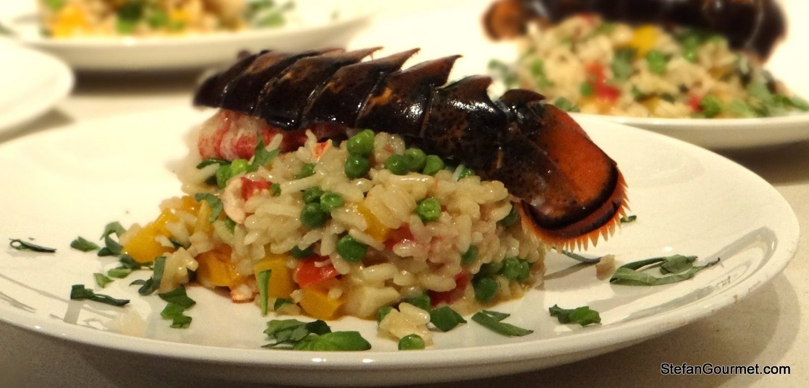 All the recipes I could find for lobster risotto did not use the lobster shells to make lobster stock to use for the risotto. They were simply a plain risotto with a lobster served on top. And so I decided to create my own recipe for lobster risotto and it turned out spectacular! I decided to cook the lobster tail sous-vide because that will keep it amazingly tender, but if you don’t have sous-vide equipment you can simply boil the lobster tail as usual and still obtain a wonderful dish. Because live lobsters are not a cheap ingredient this is something for a special occasion or a dinner party where you are looking to impress your guests. This risotto is served with the lobster tail on top, delicious lobster meat mixed in with the rice that has a wonderful lobster flavor from the stock, as well as peas, tomato, and yellow bell pepper for lovely colors. This dish has a nice contrast between the creamy rice and crunchy vegetables.