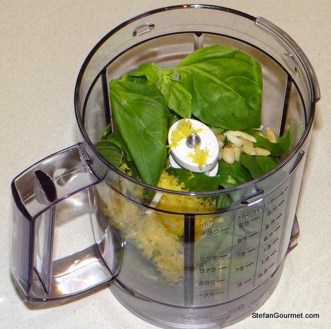 Combine the basil, garlic, pine nuts, lemon zest, lemon juice, salt, and pepper in the blender.