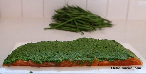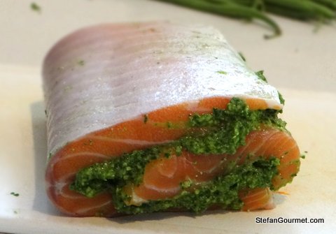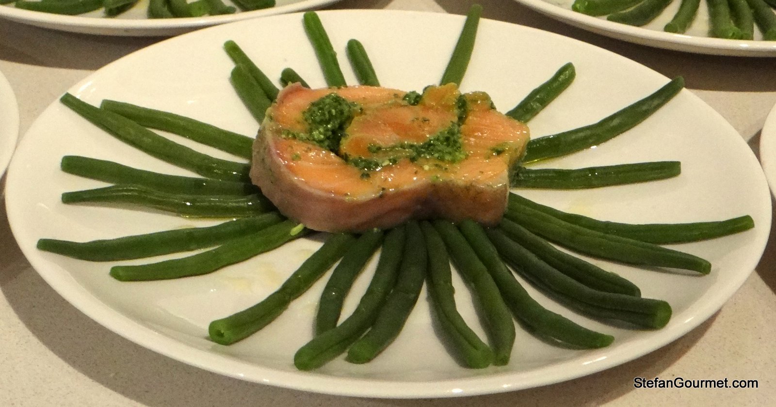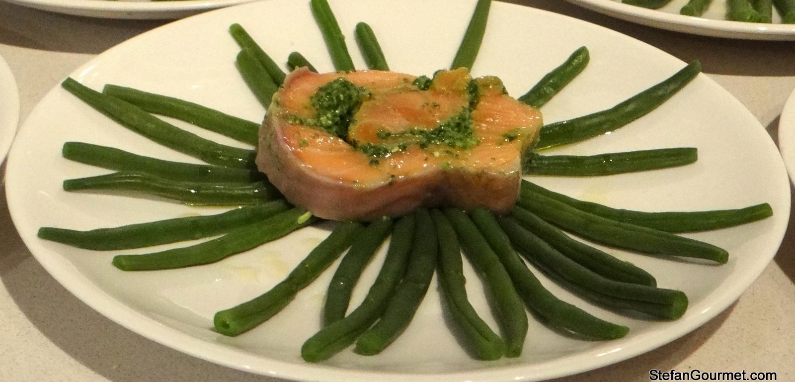 The inspiration for this dish was provided by Richard McGary’s Salmon Roulade with Cilantro Citrus Pesto on Mango Corn Salsa, but it is quite different. A salmon fillet is butterflied, filled with a basil-lemon pesto, rolled up into a roulade, cooked sous-vide, and cut into slices that are served on haricots verts. Salmon cooked sous-vide to 43C/109F is amazingly velvety, which contrasts nicely with the crispy haricots verts. The round buttery flavor of the salmon is complemented by the fresh taste of the basil-lemon pesto.