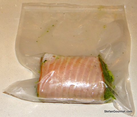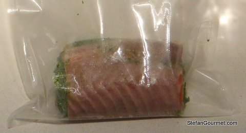 A vacuum sealer cannot be used, because that would force out most of the pesto. Insert the salmon into a ziploc sous-vide pouch instead.
