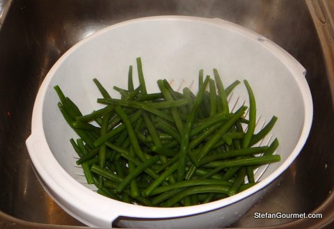 Meanwhile, snap the ends off the haricots verts. Boil or steam them with some salt for about 8 minutes or until they are cooked but still have some crunch.