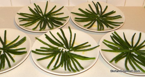 Arrange the haricots verts on the plates in a star pattern and drizzle with a bit of extra virgin olive oil.