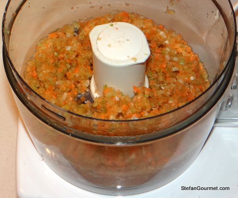 Mince the carrots, onion, garlic, and celery finely with the food processor.