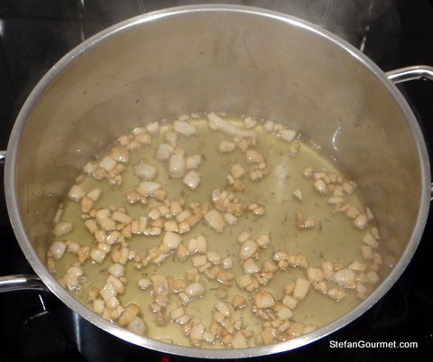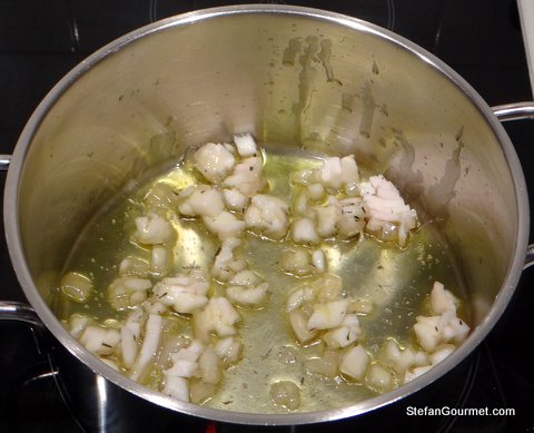 Heat the oil in a casserole and add the lardo. (It would be advisable to use a larger casserole than I did.)