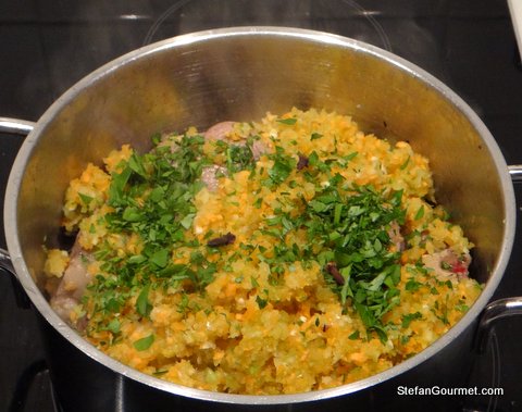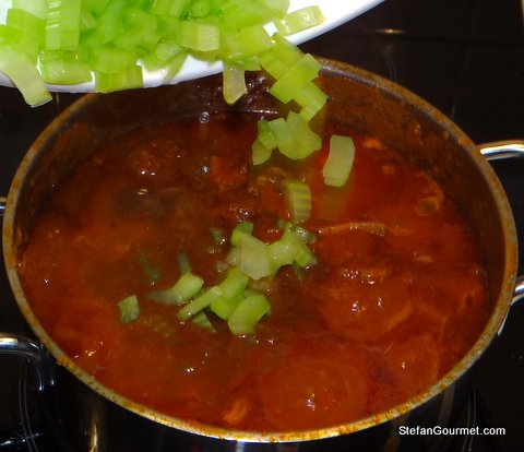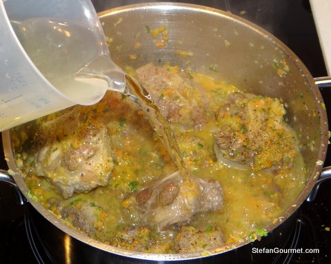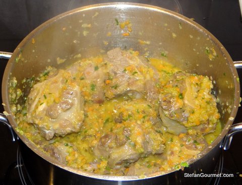 Add the minced vegetables, parsley and cloves. [The traditional recipe says to add this to the meat, but when I make this again I will take out the oxtail first and put it back in right after adding the wine.]