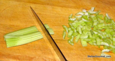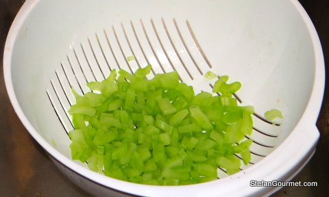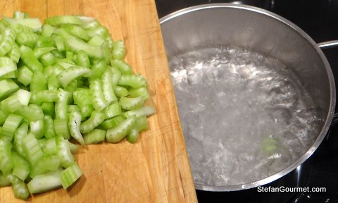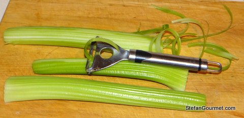 Remove the fibrous part of the celery stalks with a vegetable peeler.