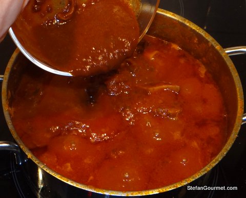 Serve the oxtail with some sauce. As a wine pairing a red from Lazio such as a Cesanese del Piglio would be traditional, but this dish is great with many full-bodied red wines.