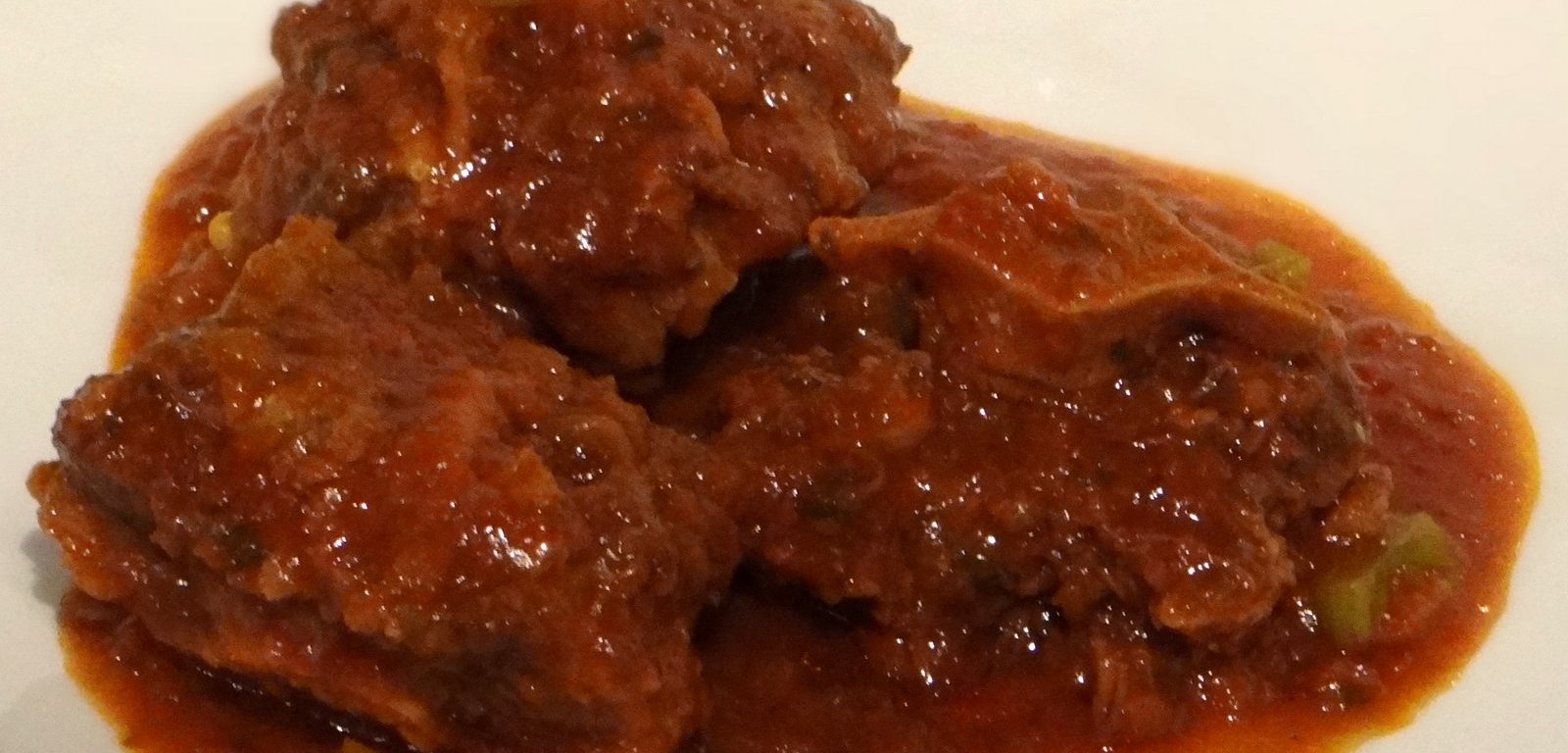 All regions of Italy have their own traditional dishes, referred to as piatti tipici. I like to cook my way through Italy by trying piatti tipici from different regions. Coda alla Vaccinara is a typical dish from the cucina povera (poor man’s kitchen) of Rome (Lazio). Oxtail is part of what is called the quinto quarto (the fifth quarter), the less desirable parts of an animal that remain when all the nice parts have been taken. As often with traditional Italian dishes, there are many different versions. I made an elaborate version with raisins, pine nuts, and cocoa powder in the sauce. The sauce can be served over penne rigate or rigatoni, which is called Rigatoni al Sugo di Coda.