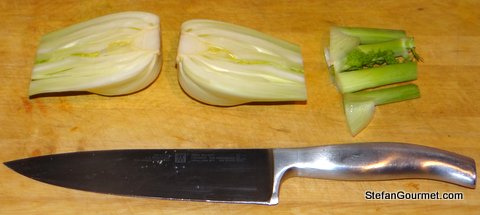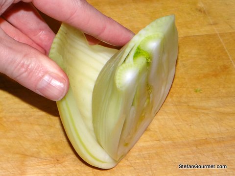 Cut the green stalks and fronds off the fennel and discard. (You can save the fronds for garnish and the greens for making stock.)