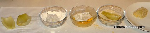 Set up an ‘assembly line’. First dip each piece of fennel in flour and turn it around to coat on all sides. Shake off excess flour. Dip into beaten eggs, coating on all sides and shaking of excess egg. Finally dip into breadcrumbs, coat on all sides and shake off excess breadcrumbs. Arrange the breaded fennel on a plate in a single layer.