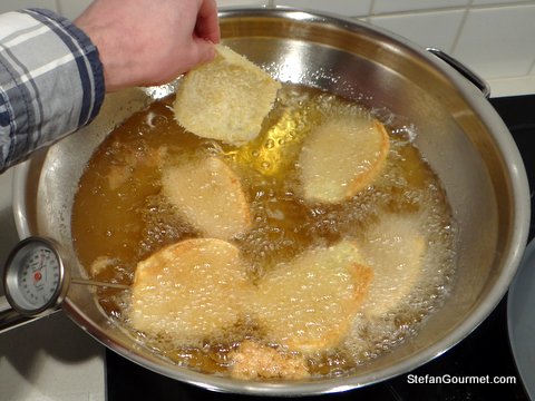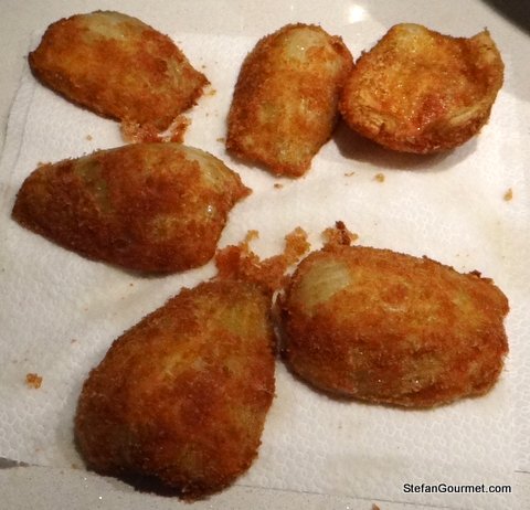 Deep fry for a few minutes until golden brown. Drain on paper towels. Season with a bit of salt and serve as soon as possible before the crust becomes soggy.