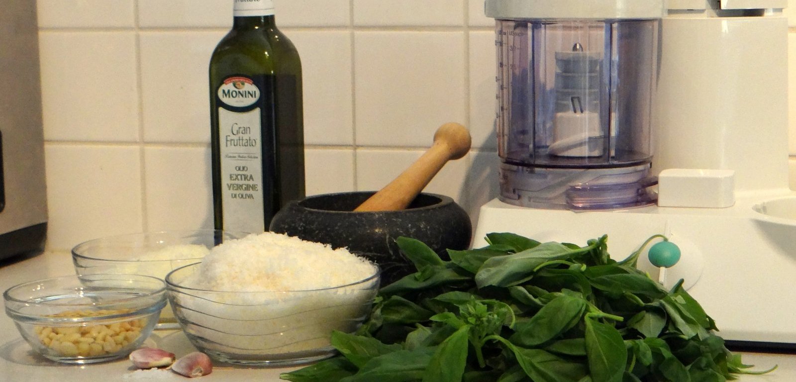 Pesto alla Genovese is the original pesto from the city of Genova in Liguria. For this comparison of man versus machine I have used the official recipe of the Consorzio del Pesto Genovese that prescribes to use only basil, garlic, parmigiano, pecorino, pine nuts, extra virgin olive oil, and salt. When I was in the US I noticed that the basil there has a mint-like flavor that is different from the basil used in Liguria. Use Italian-style basil if you can for the original flavor.