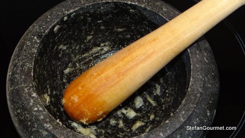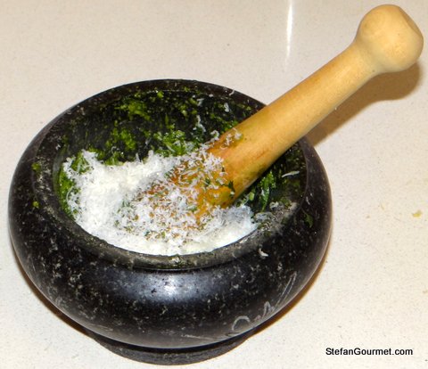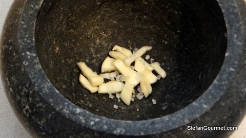 The consorzio says you should use a marble mortar (I used granite) and wooden pestle. Start with the garlic (coarsely chopped) and a pinch of coarse sea salt.