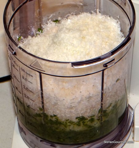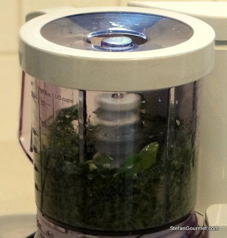 Process at low speed, stopping to scrape down the sides as necessary. Do not process longer than necessary to avoid warming up the pesto too much.