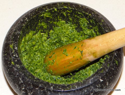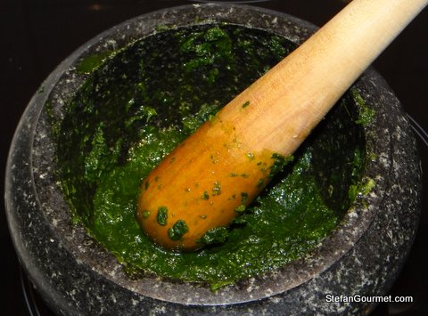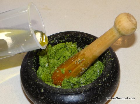 Add the olive oil slowly and keep grinding until all of it has been incorporated to finish your pesto made by hand.