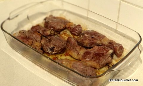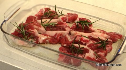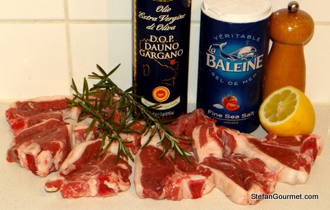 The name is quite elaborate but the dish is not. It is Italian cooking at its best: good ingredients to which you do as little as possible. In this case lamb chops, extra virgin olive oil, salt, and freshly ground black pepper. Optional ingredients are rosemary and garlic to marinate the lamb, and a slice of lemon to serve them with. The lamb can be prepared on a piastra (cast iron plate) or, as I did in this case, in a very hot oven. A cast iron plate will probably give slightly better results (better browning while keeping the meat pink inside), but is more messy. Note added 13 July 2013: the griddle does give a better result.