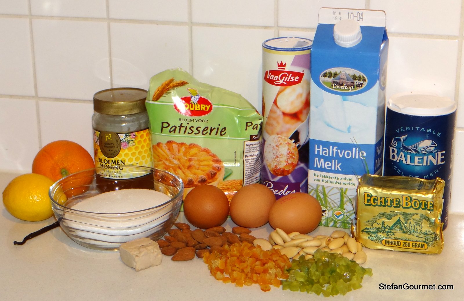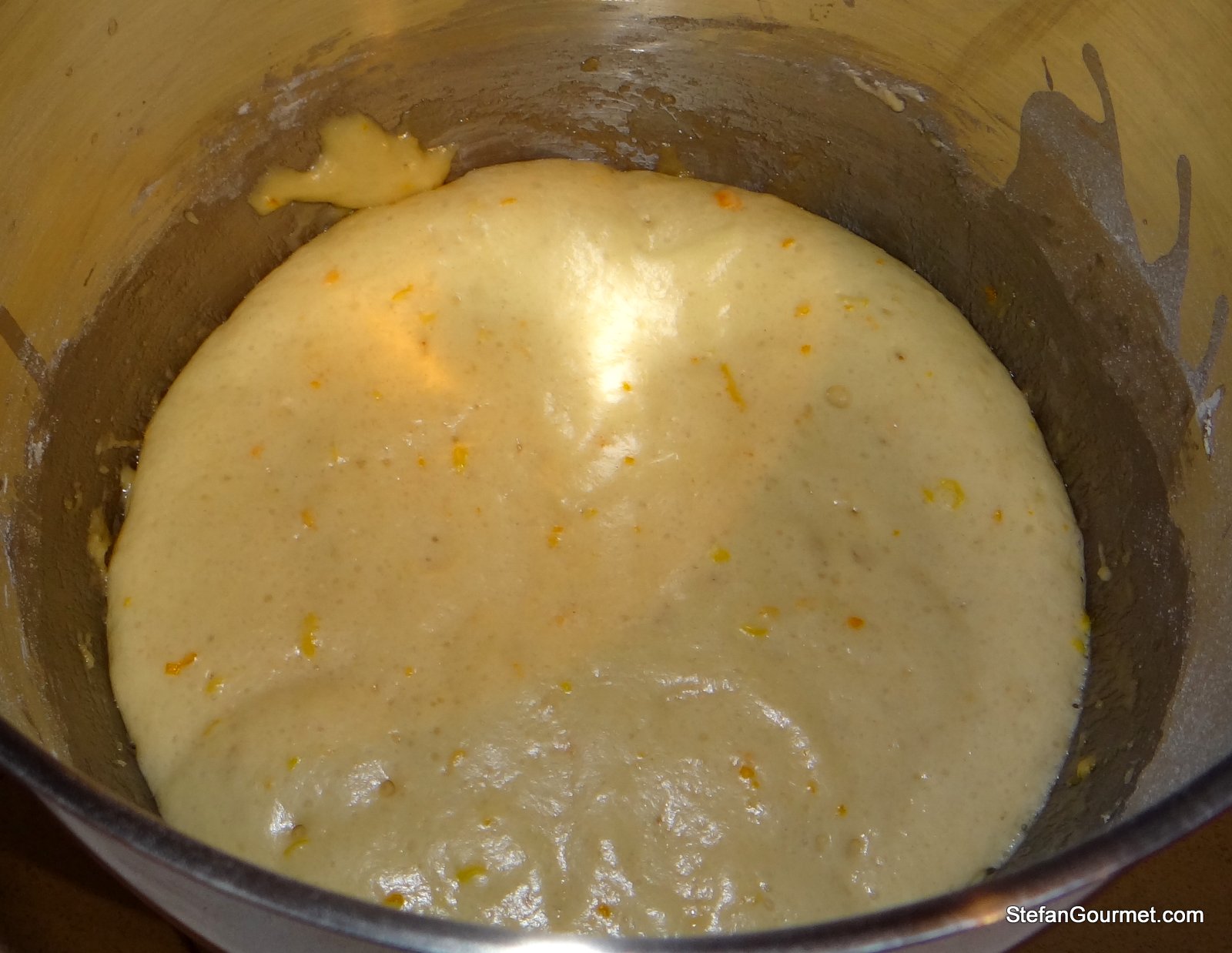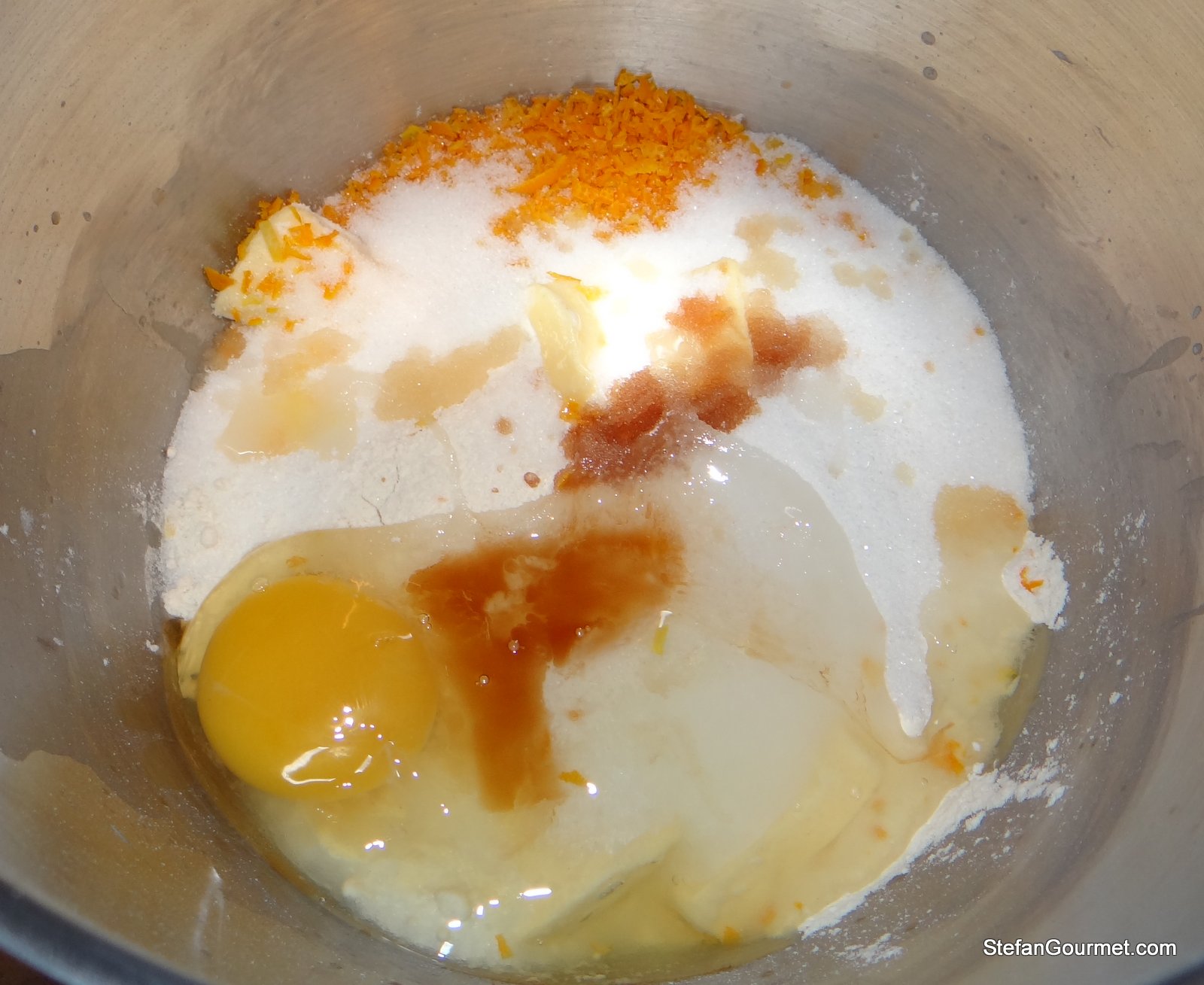 Add 1 egg, the remaining sugar, the lemon and orange zest, a pinch of salt, 200 grams (1 1/4 cup) of the flour, 50 grams (3 1/2 Tbsp) of the butter, the remaining milk (again lukewarm around 37C/98F), the vanilla, and the orange extract if using.