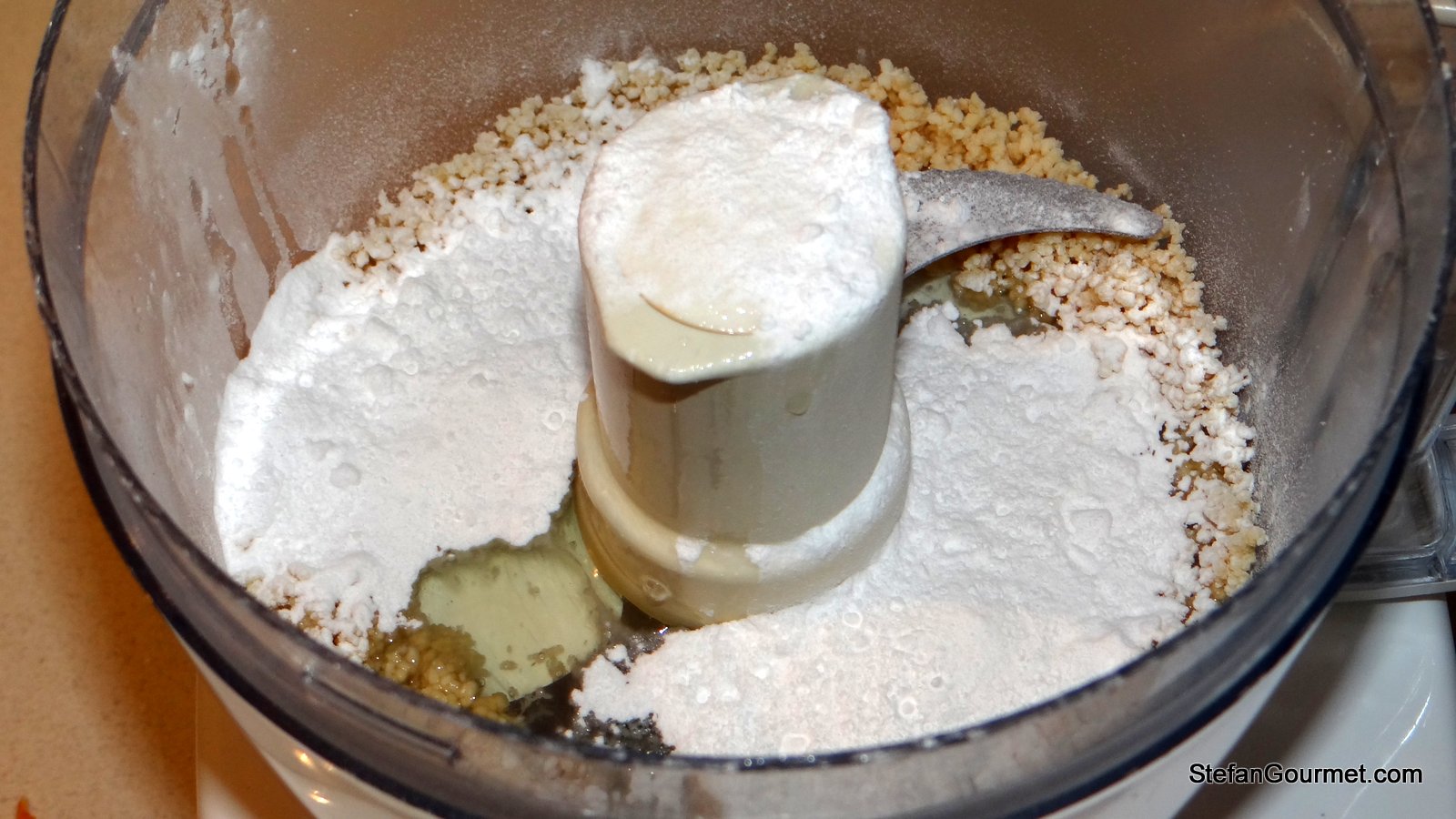 Make the glaze by grinding the white almonds into almond flour in the food processor or blender, or just use almond flour.