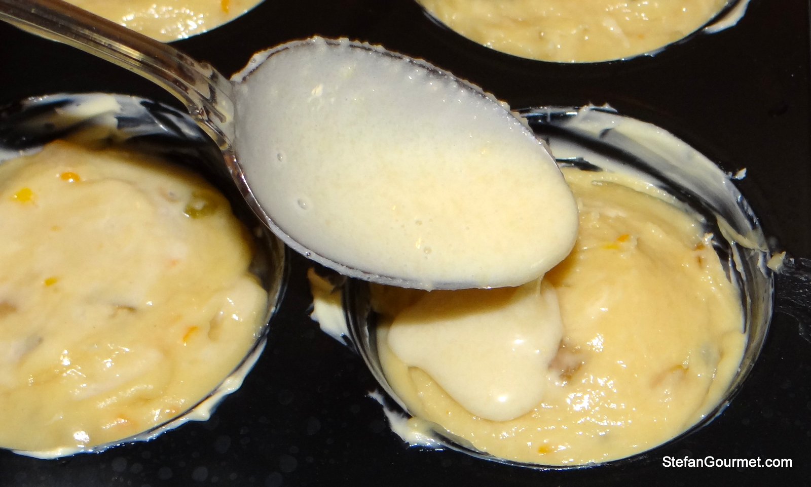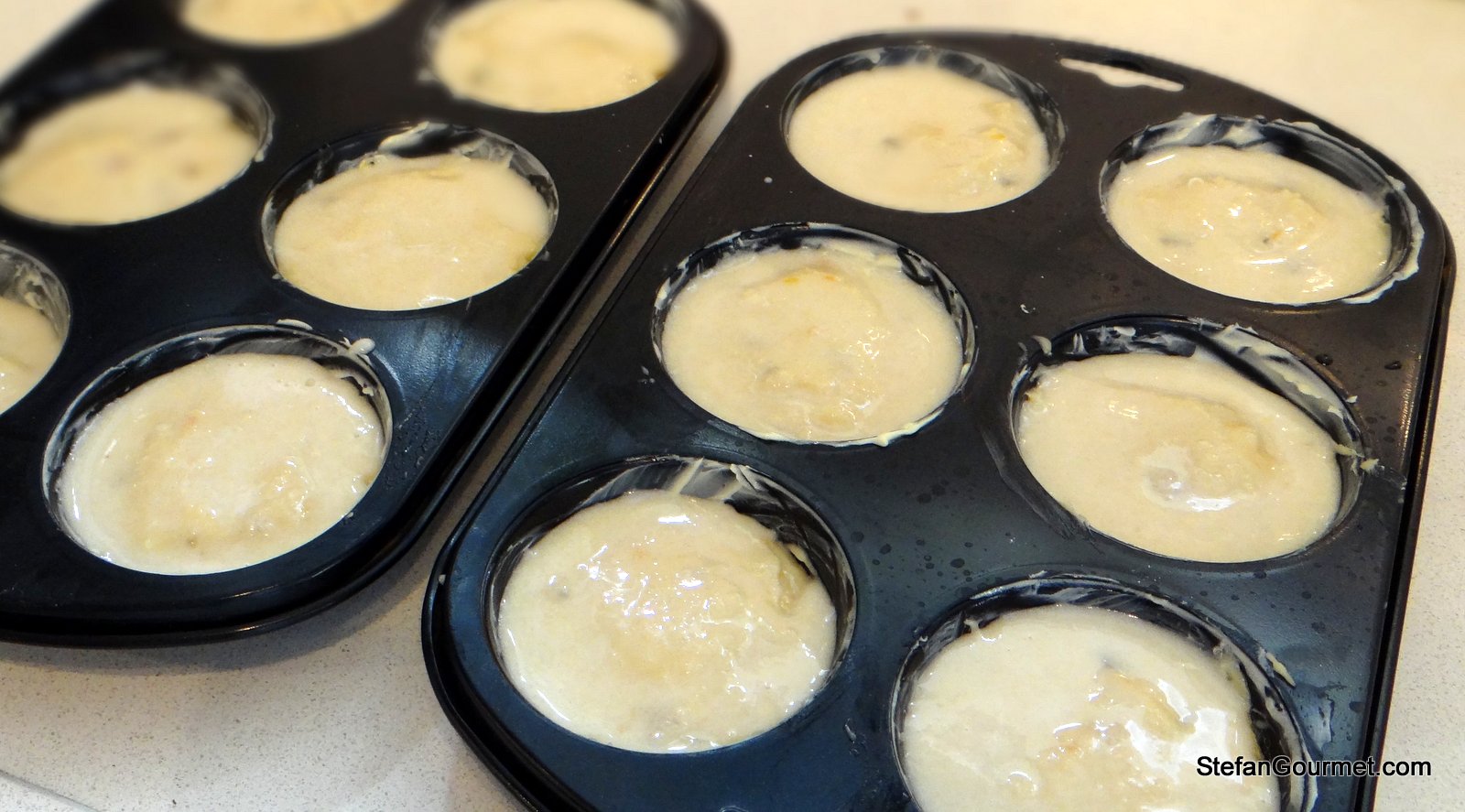 Use a wet spoon to even out the top of the dough. (Make the spoon wet again after each two muffins or so. You’ll notice the difference between a dry spoon and a wet one immediately.)